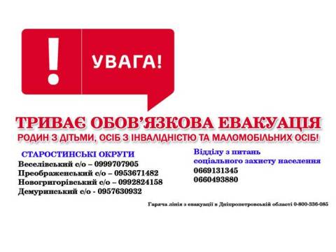 Ситуація у Синельниківському районі вимагає якомога швидшої евакуації до більш спокійних місць. Межівська сільська територіальна громада повідомдяє, що безпекова ситуація в громаді ускладняється. Триває обов’язкова евакуація родин із дітьми, осіб з інвалідністю та маломобільних людей. Дітей з території Межівської громади слід евакуювати невідкладно.