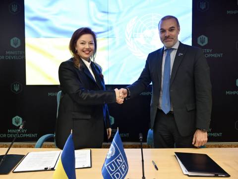 Фінансову угоду в Києві підписали Альона Шкрум, Перша заступниця Міністра розвитку громад і територій України, та Христофорос Політіс, заступник Постійного представника ПРООН в Україні.