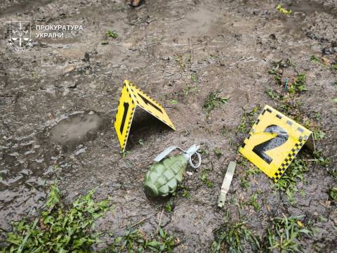 Під час огляду місця події правоохоронці вилучили предмет, схожий на гранату, запал та інші частини гранати. Вилучені речові докази направлено на експертизу.