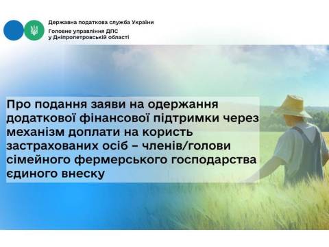 Згідно з п. 5 Порядку надання сімейним фермерським господарствам додаткової фінансової підтримки через механізм доплати на користь застрахованих осіб – членів/голови сімейного фермерського господарства єдиного внеску на загальнообов’язкове державне соціальне страхування, затвердженого постановою Кабінету Міністрів України від 22 травня 2019 року № 565 9із змінами) (далі – Порядок № 565), для отримання сімейним фермерським господарством додаткової фінансової підтримки через механізм доплати на користь застрахованих осіб – членів/голови сімейного фермерського господарства єдиного внеску на загальнообов’язкове державне соціальне страхування (далі – додаткова фінансова підтримка) голова сімейного фермерського господарства подає не пізніше ніж за п’ять робочих днів до початку місяця до контролюючого органу за місцем свого обліку як платника єдиного внеску на загальнообов’язкове державне соціальне страхування (далі – єдиний внесок) відповідні заяви на одержання додаткової фінансової підтримки через механізм доплати на користь застрахованих осіб – членів/голови сімейного фермерського господарства єдиного внеску на загальнообов’язкове державне соціальне страхування (далі – Заява) за формами згідно з додатками 1 і 2 до Порядку № 565 від себе та усіх членів сімейного фермерського господарства (крім членів/голів сімейного фермерського господарства, які підлягають страхуванню на інших підставах або звільняються від сплати єдиного внеску відповідно до частини четвертої ст. 4 Закону України від 08 липня 2010 року № 2464-VІ «Про збір та облік єдиного внеску на загальнообов’язкове державне соціальне страхування» (із змінами та доповненнями), та не беруть добровільної участі у системі загальнообов’язкового державного соціального страхування, не мають права на отримання додаткової фінансової підтримки).